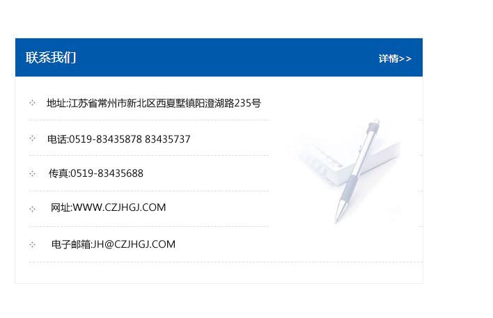 地址:常州市新北區友邦商務大廈1幢16、17層  電話:0519-85101652  傳真:0519-85112595  郵編:213022  網址:www.cz-jiayue_cn.hkants.com  郵箱:xiajifengaa@163.com